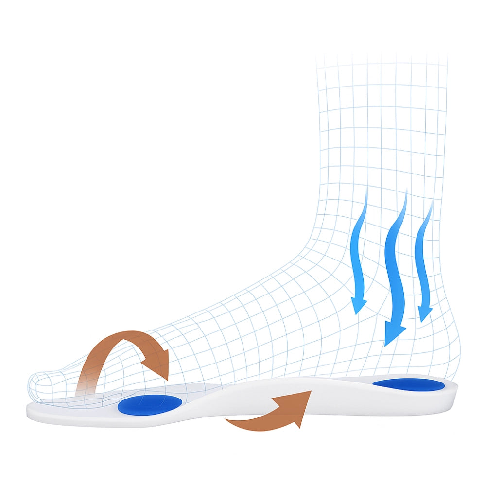 The SoftCUSH® insole combines soft gel and arch support to absorb shocks, reduce pressure, and protect your joints. Adjustable to all shoe sizes, it ensures lasting comfort, perfect balance, and a smooth walk every day.