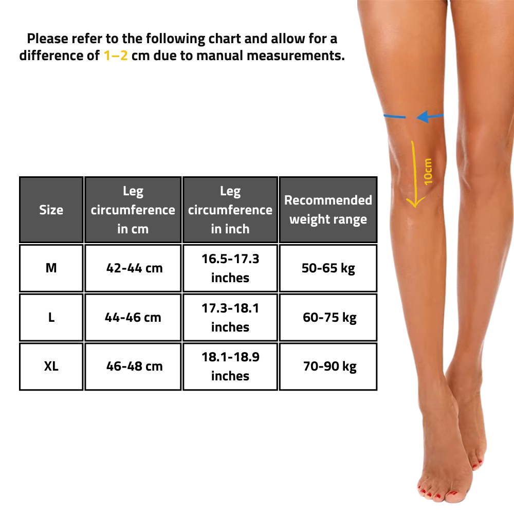 Measure the circumference of your knee or thigh according to the product’s sizing chart. An adjustable model ensures a secure fit for most body types.